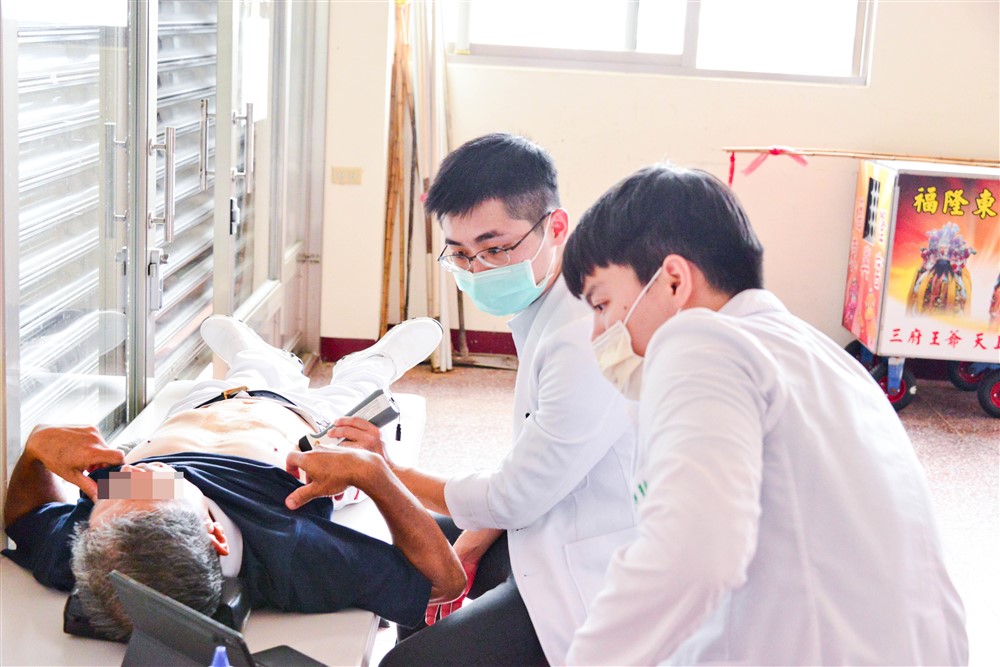 陳政良醫師攜帶醫療配備為病人進行腹部超音波檢查,台北慈院PGY 王嘉紳醫師(右)認真觀摩學習。