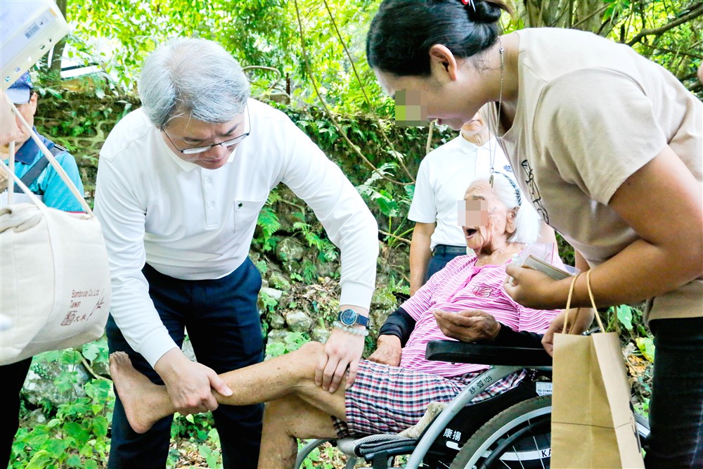 車隊行經狹窄蜿蜒的山間小路,從這村到那村,一家走過一家,往診關隊悉心診察個案傷口,關心他們的生活情形。有百歲長者甚至上午八點多,就已坐上輪椅,在家面前的大樹下引頸期盼人醫到來。而鮑醫師一下車就近身蹲在阿公旁邊,就地關懷,並教導外籍看護如何協助為長輩做復健。