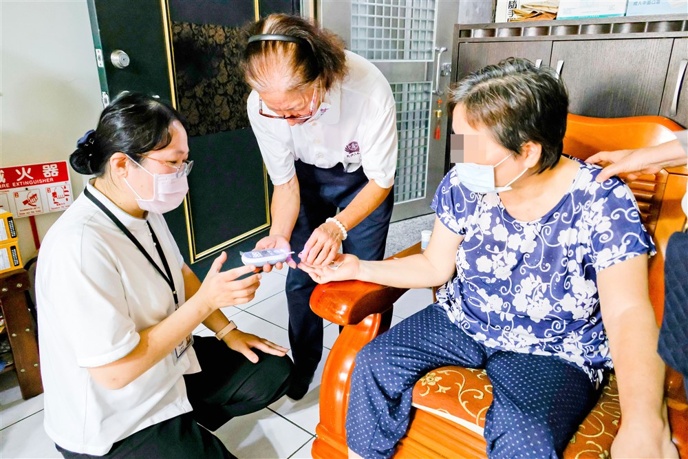 賴阿嬤年事已高,活動力差;曾跌倒二次,左髖關節開過刀,左膝蓋及小腿會痠痛。經陳江山醫師檢查,推敲可能是脊椎神經壓迫所致。團隊研商討論需要為賴阿嬤安排脊椎門診,也叮嚀她要勤做復健、補充鈣質及防止再跌倒。陳醫師還巡視了長輩房間的插座,建議電視使用的延長線缺少保護裝置需更換,貼心仔細的程度,如同關心自己的父母一樣。