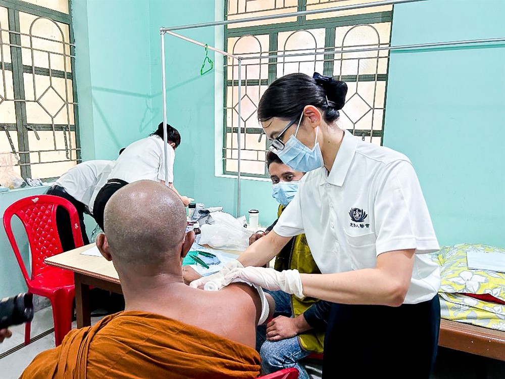 新加坡何欣芩醫師(右)為法師診治並包紮傷口。攝影/朱秀蓮