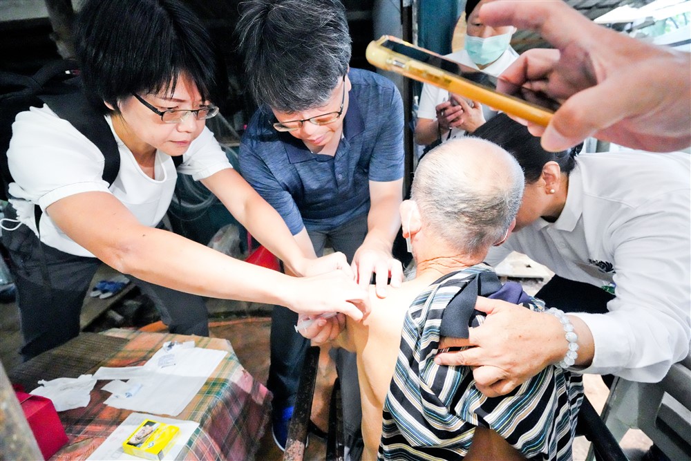 骨科陳江山醫師(左二)與太太李佳蓮護理師(左)為邱阿公打針治療,減緩他的左肩處發炎疼痛的問題。攝影/李政明