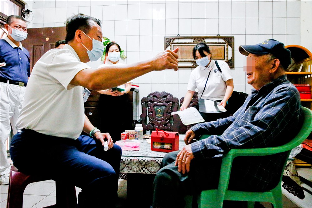 十分寮居家關懷線由有二十多年義診經驗的汪津樑中醫師帶領二十多位志工前往服務。為八十五歲的楊阿嬤聽診後,家屬提到老人家現在不太說話,看到人也沒有反應,甚至現在吃東西都會忘記怎麼吞下去……。汪醫師凝神思考,建議請家人盡早帶阿嬤到神經內科做檢查,並細心交代後續該處理的事項,安撫家屬的心情。