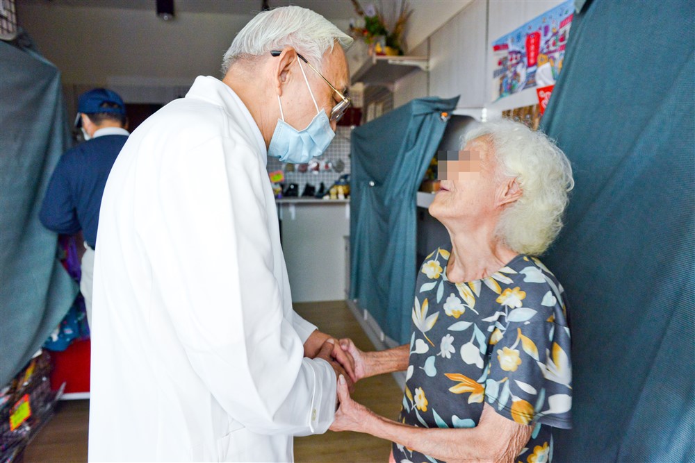 十分寮居家關懷線由汪津樑醫師(左一)帶隊服務,阿嬤開心握住醫師的直道謝。攝影/洪易辰