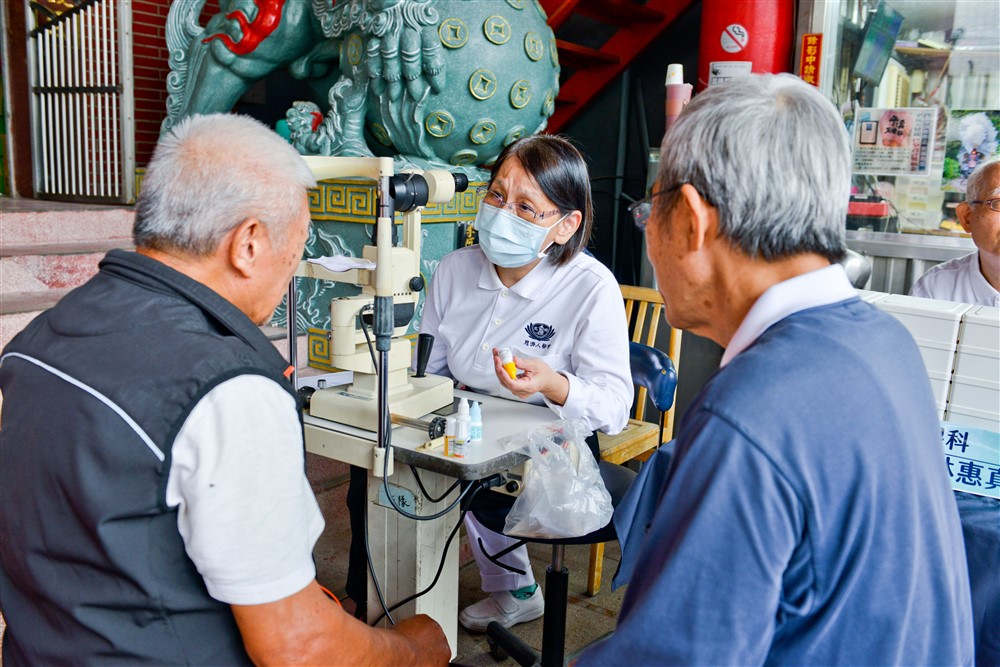 今天在十分寮成安宮的駐點義診有眼科醫師服務,年長者眼睛老化乾澀較易產生病變,前來就診的民眾特別多。「這是乾眼症,還需要持續追蹤喔!」北區人醫林惠真醫師雖然行動不便,卻阻礙不了她行善的心,十五年來持續透過義診發揮專業,照顧志工和鄉親的眼睛健康。「我愈做愈法喜,能夠發揮身體的良能,真的很喜悅。」