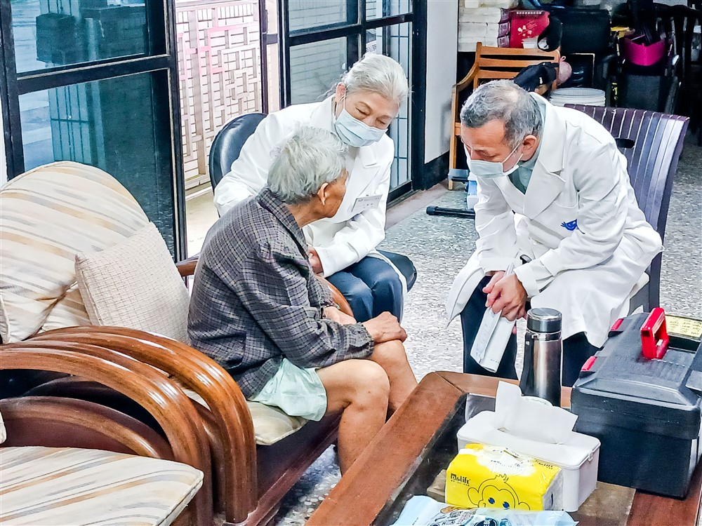 嶺腳南線往診由呂張却中醫師與劉文俊醫師帶隊進行關懷。呂張却中醫師義診經驗豐富,遇到心情比較鬱悶、滿臉愁容的長者,她認真聆聽傾吐憂愁,並輕言安慰,幫助舒展心情。劉文俊醫師為走路會痛的阿嬤細心問診檢查,發現其習慣用兩隻竹竿當拐杖並不妥適,勸使用女婿買給她有止滑效果的正常助行拐杖才比較安全。對於長者的用藥,劉醫師也與藥師李麗俐再三討論確認,並清楚交代家屬和外籍看護;同時也照顧家屬的健康,清楚的衛教說明貧血和低血壓的差異,讓病家都能得到解惑而安心。