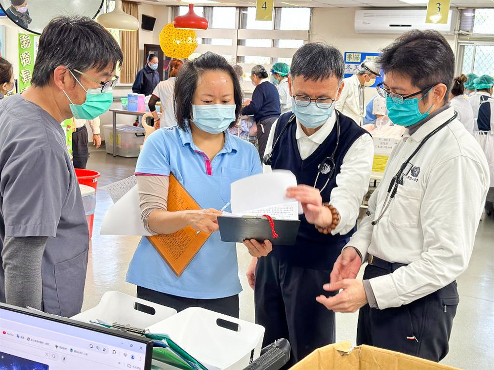 十二月二十九日彰化人醫志工團隊前往衛生福利部彰化老人養護中心為住民進行洗牙服務,陳俊志醫師(右一)、唐龍文醫師(右二)在護理站與養護中心人員關注著每位長者的身體狀況。