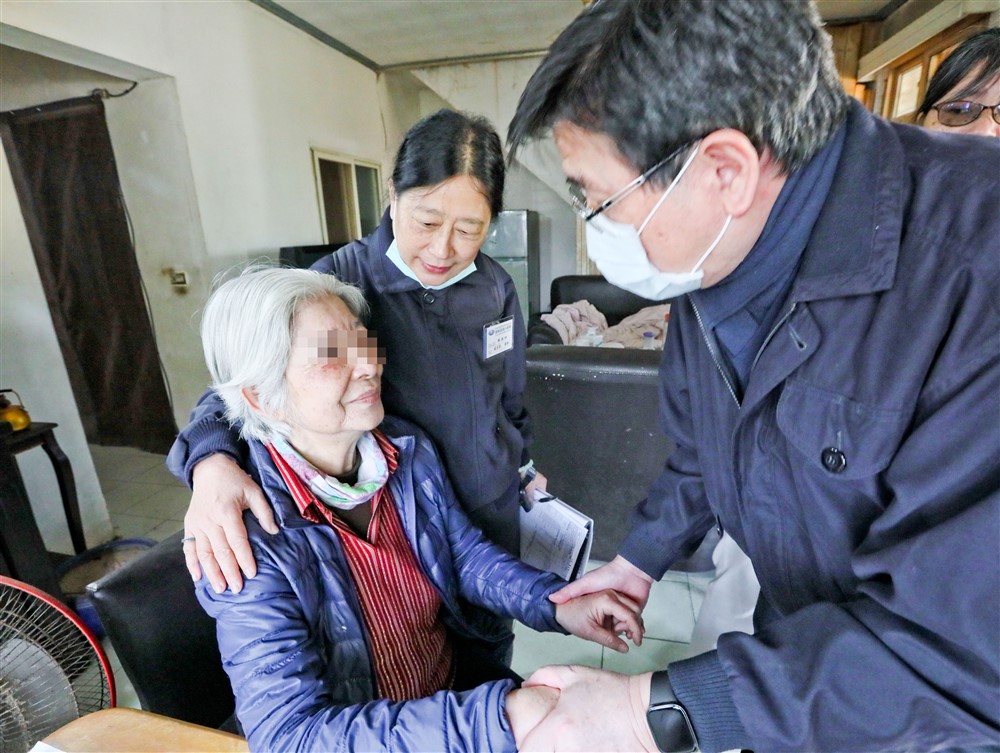 「天氣冷,早上起床有穿暖嗎?」來到賴阿嬤家關懷,北區人醫林俊傑醫師握住她的手問候。見到熟悉的人醫志工們,阿嬤不禁傾訴心事。志工洪秀梅趨前安慰阿嬤:「妳的傷心我們都放在心上,不用擔心。」也說明會協助詢問申辦補助資源事宜。接著眾人陪伴阿嬤外出晒晒太陽,幫助轉換老人家憂傷消沉的情緒。