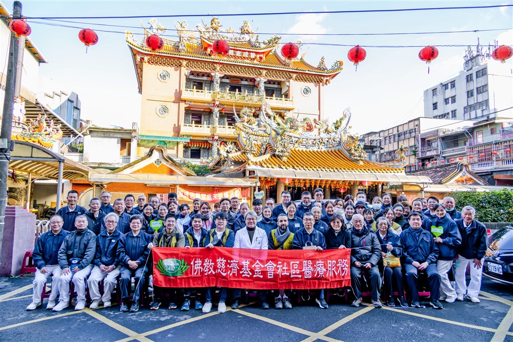 二○二五年一月十二日一早北區人醫志工團隊齊聚於三芝智成忠義宮,準備進行三芝石門往診服務。亞東醫院骨科部鮑卓倫醫師(第一排左八)攜來自阿爾及利亞的納迪爾醫師(第一排左九)參與,實地體驗慈濟醫療人文關懷行動。攝影/簡聰田