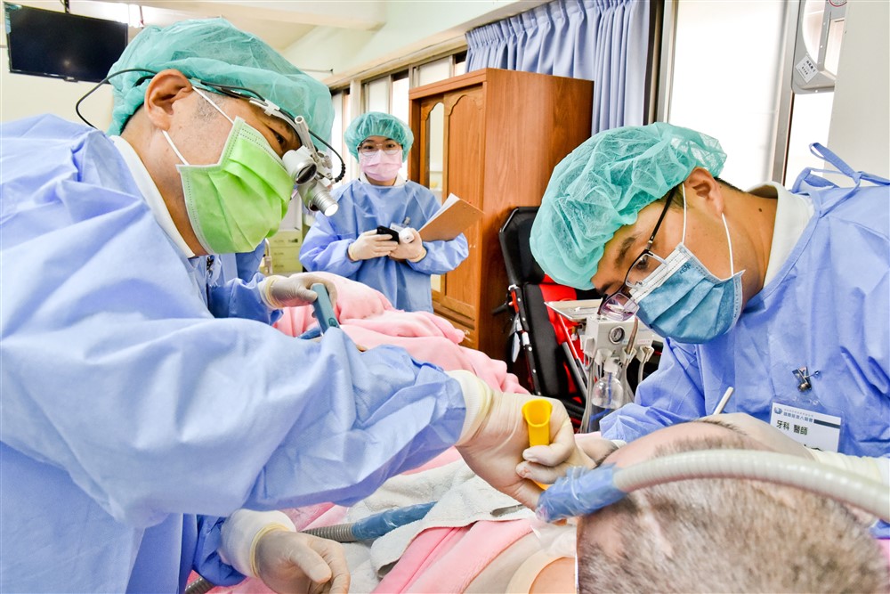 謝金龍醫師為一床一床的住民診視口腔、洗牙;為有蛀牙的住民拔牙與補牙,也指導後進醫師在洗牙儀器上的使用操作。謝醫師自二○○八年投入植物人牙科義診,「過往使用的器材很克難,但隨著醫療科技演進,現在有Aseptico 儀器,是二大四小的六孔和有加照明的手電筒設備,洗牙時,就不用再打燈光,也能將沖洗的水,輕易沖排出。」道出牙科團隊在技術與設備上的與時俱進。