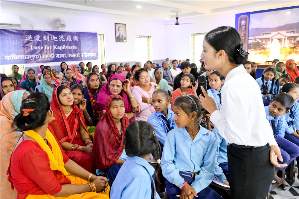新加坡志工洪德謙師兄致歡迎詞後, 由本土志工希瑪(Seema Dharikar)、阿麗札(Aliza Chaudhary) 介紹慈濟的理念與竹筒歲月,接著由藍毗尼慈濟義診所醫護同仁帶來「生活健康講座」。