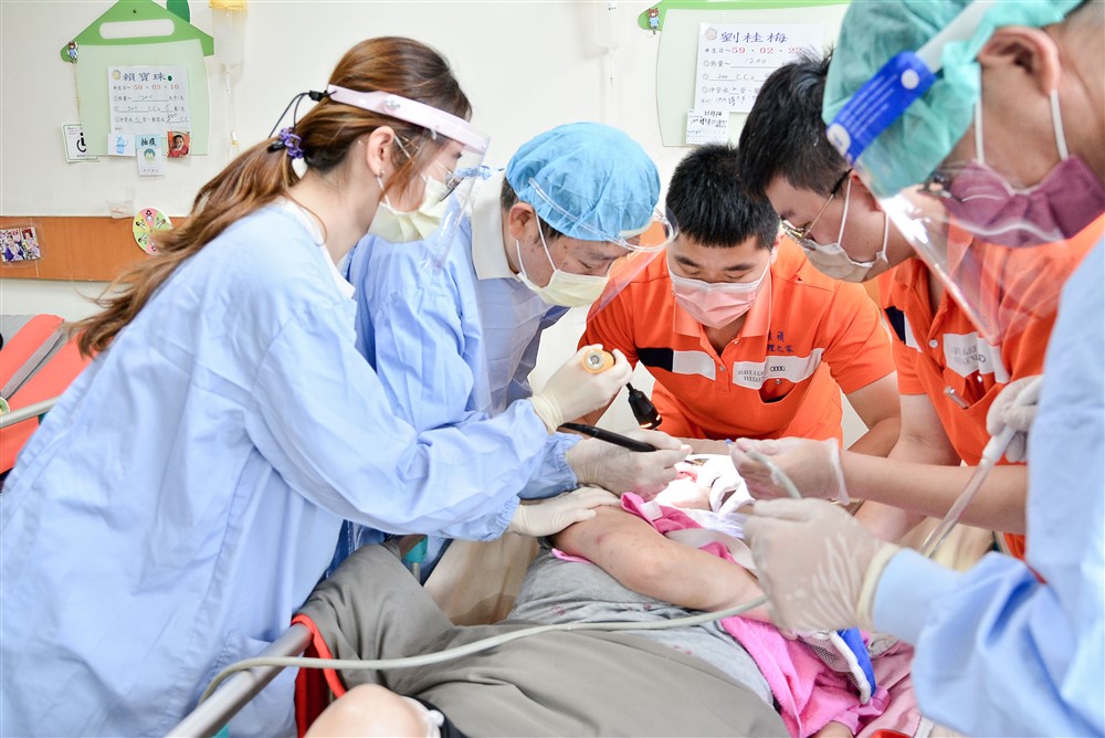 「拜託! 拜託!」、「感恩! 感恩!」、「對!對!對!太棒了!」⋯⋯為了讓插管的長者們願意張口洗牙,除了醫師耐心地安撫溝通、志工協助或打燈或翻身,加上院方照護人員專業的口腔按摩,多人通力合作,就是為了確實維護每一位住民的口齒健康。