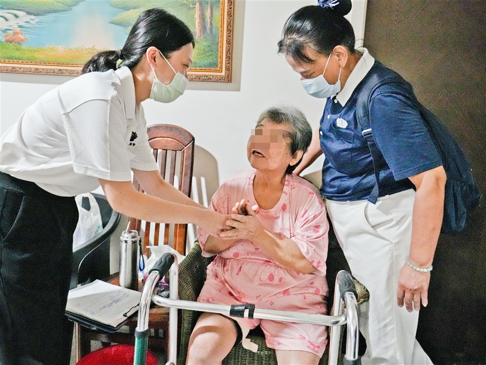 蔡阿嬤的髖關節問題在等待進一步治療,忍著不舒服仍每天在家走路避免退化,她難過道出身體病痛讓生活變得很辛苦。張秀霞師姊安慰蔡阿嬤,身體用了那麼多年,還養大了那麼多小孩,很厲害、很有福報。臨別前,團隊一齊為蔡阿嬤唱歌祝福及打氣。