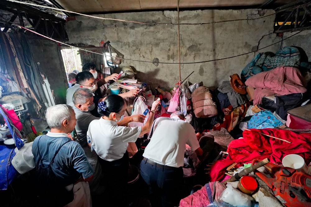 阿木棲身在堆滿雜物、猶如廢墟的工寮裡。一室昏暗悶熱中,志工們紛紛拿出手機照明燈,好讓八十七歲的陳文德醫師為躺在簡陋床鋪上的阿木看診,處理皮膚發癢問題。「身體要用水擦。我開個藥膏,早晚要擦喔!」中區人醫會窗口葉慧芬護理師提及,阿木雙腳都置換過人工關節,左腳截肢,不良於行,與家人關係疏離,對各方的善意相助總是拒於門外。這兩年多來中區人醫志工們持續不懈的關心,讓他逐漸卸下心防,接受醫護為他看診、清理腳部的傷口。接連再訪了幾位阿公阿嬤,陳醫師不僅細心聽診檢查,也衛教日常穴位按摩保健之道。