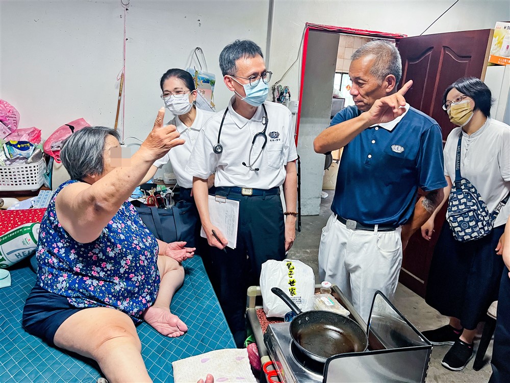 黃共璧醫師、陳麗鳳護理師、楊琇米藥師、商碧芸社工與志工們逐戶拜訪七位長輩。黃醫師對每位個案的狀況都瞭若指掌:有皮膚問題的,補給塗抹藥膏幫助改善;家屬提問高齡長輩在營養攝取上的需求,給予飲食衛教;若有用藥問題,也與藥師一一釋疑解惑;對於獨居長者,多加了解日常起居,噓寒問暖。
