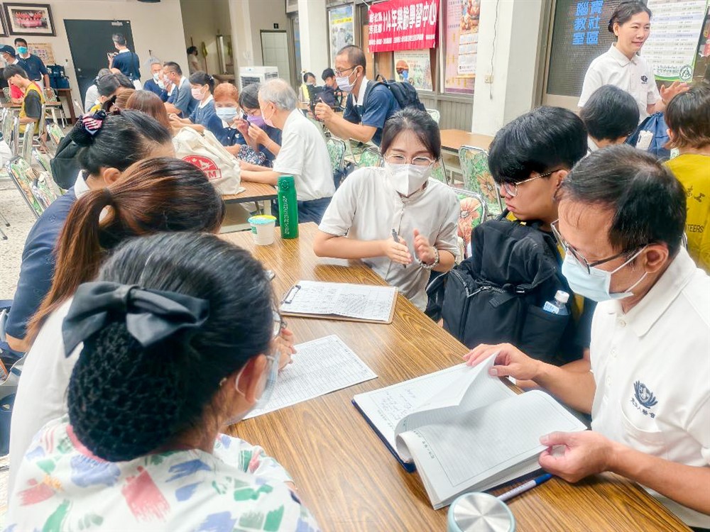 另一組隊伍來到新寶村和新生村進行關懷。來到王家,洗腎病友王爸爸前些日子檢查出胃出血,治療後有所改善,李慧黛藥師為其檢視平時用藥,特別將胃藥拿出來,叮嚀他一定要吃。邱玉亭護理師量測血壓和血糖值後,叮嚀洗腎要避免吃楊桃,並且將王爸爸從醫院帶回來的衛教卡攤開,再次詳細說明。