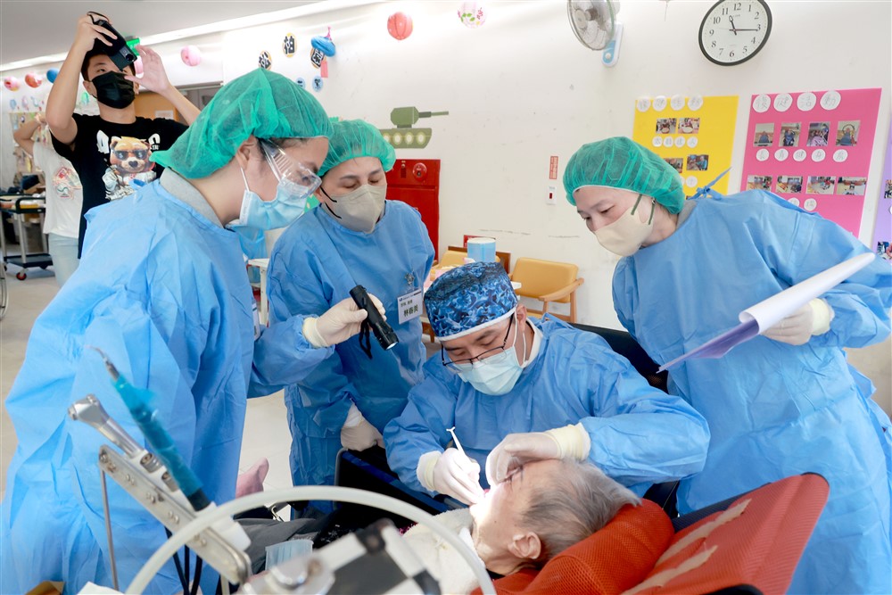 松柏園老人長期照顧中心義診,郭玟鑫醫師(右二)與牙科小組為住民洗牙。