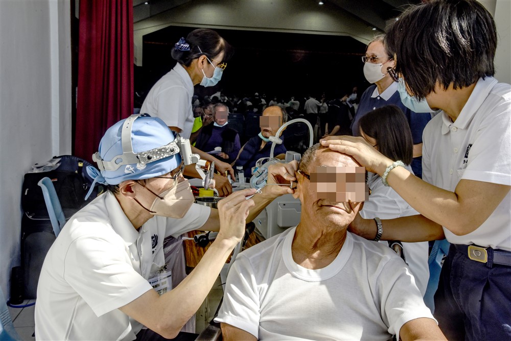 黃正輝醫師發揮耳鼻喉科專業,為院民處理耳垢、耳膜破損與慢性中耳炎等問題,許多長者當下就聽得清楚,露出驚喜笑容。「很多長者以為聽不見是退化,其實只是沒被好好看見。」