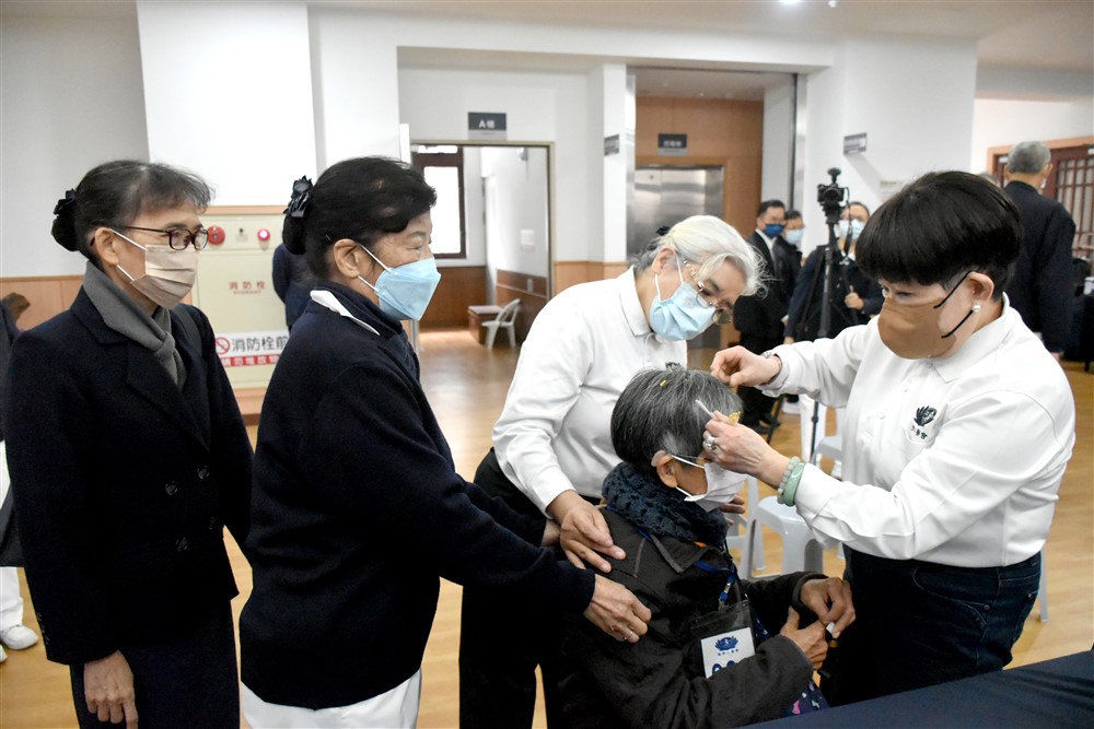 七十六歲的獨居長者曾阿嬤患有夜盲症、雙耳使用助聽器。因為視力不佳,志工牽著她的手陪伴看診。此行因為頭脹不適,接受中醫針灸療法,曾阿嬤開心的露出燦爛笑容說:「因為行動跟視力不好,有一陣子沒有針灸了,今天針灸完,我的頭脹就改善了!我覺得來這裡好溫暖、好溫馨!」此行她也捧著沉甸甸的竹筒,裡頭的零錢滿是日常點滴心意累積匯聚而來,在志工牽扶下完成倒竹筒儀式,將點滴愛心匯入功德海。