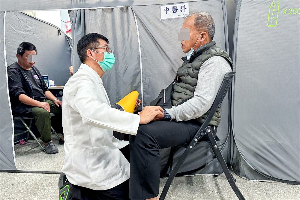 福慧隔屏所隔出的看診空間中,高屏區人醫吳森醫師為手腳痠痛的病人施以針炙療法;北區人醫陳文慶中醫師藉由穴位按摩為病人治療,「很多鄉親經歷這一場大災難,身心受創產生失眠的症狀,這幾個穴位能幫助他們放鬆。」