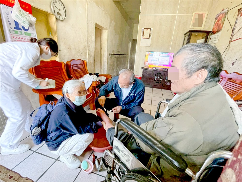 東山村石坑往診線上,八十八歲的陳文德醫師帶隊一行七人,家訪五位個案。眾人爬上二十多個階梯,來到陳先生的家探望,不良於行的他,左腳大拇趾有化膿的傷口,陳醫師見狀請慈濟志工黃鈺媛拿溫水和肥皂過來,二話不說蹲下來就幫個案把腳洗乾淨,再進行清創、上藥與包紮。接連再訪幾位案家,陳文德醫師無不細心檢查,親自示範指導照護教學,甚至是剪趾甲,看在第一次參與往診的蘇翊喬護理師眼裡,滿心感佩不已,「陳醫師很厲害,從來沒看過醫生會幫病人洗腳,竟然還幫剪腳趾甲,真的是視病如親,我會以陳醫師為楷模,未來對待病人會更加溫柔和體貼。」