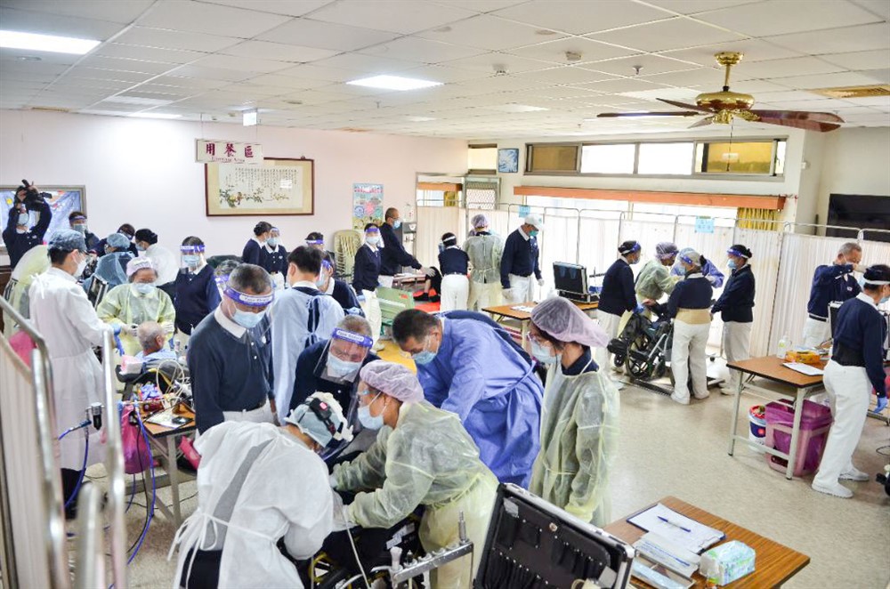 義診總籌陳思云師姊說明,機構內有七成以上是失能、失智的病人,大都插管且沒有行動能力。「此次的服務對象包含重症區的長期臥床者,由於身體僵硬,且身上都插著三管,更增加作業上的難度。人醫志工們不時得變換各種姿勢,有時蹲、有時跪,才能順利的完成任務。」