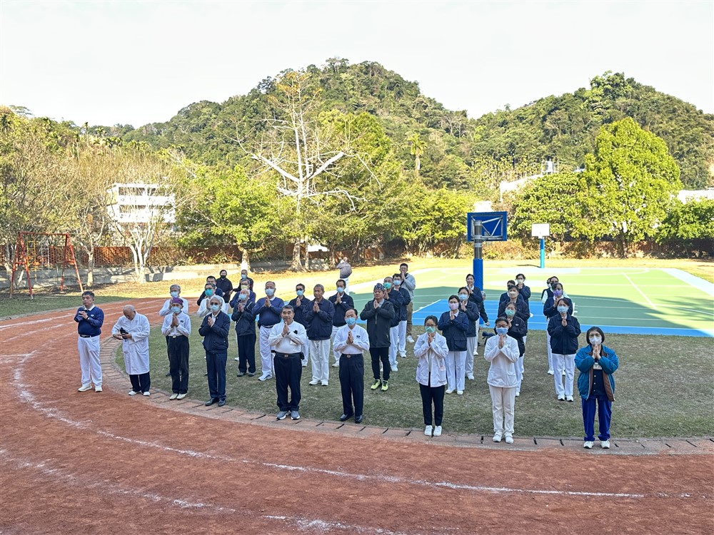 二月二十二日中區人醫會結合豐原及清水區慈濟志工共七十四人團隊進行新社義診暨往診服務,開診前眾人合十祈禱。