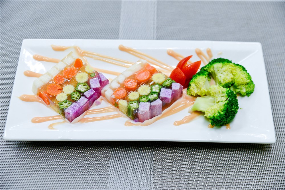 「五彩蔬菜凍」以白、橘、紫、黃、綠五種顏色的蔬果入菜,用營養豐富的蔬菜高湯製成蔬菜凍,顏色吸睛,作法簡單。