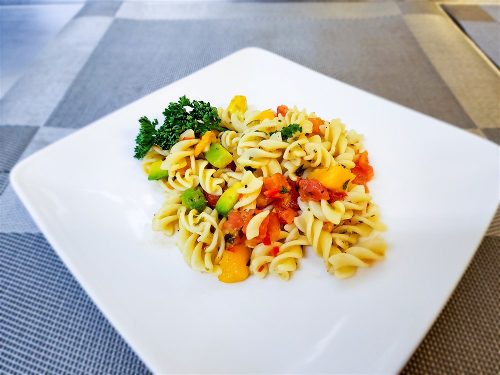 食材: 通心麵250 克、莎莎醬、愛文芒果1 顆(約300 克)、酪梨1 顆(約150 克)、馬札瑞拉起司絲50 克、巴西利5 克