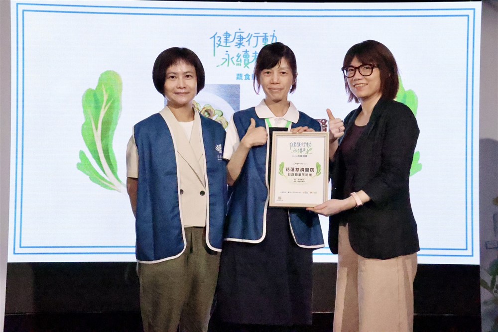 花蓮慈院營養科設計「彩蔬蘋果芋泥捲」獲得健康行動低碳蔬食組「最佳創意獎」肯定。營養科主任劉詩玉(左)和廚師莊淑倩(中)代表受獎。