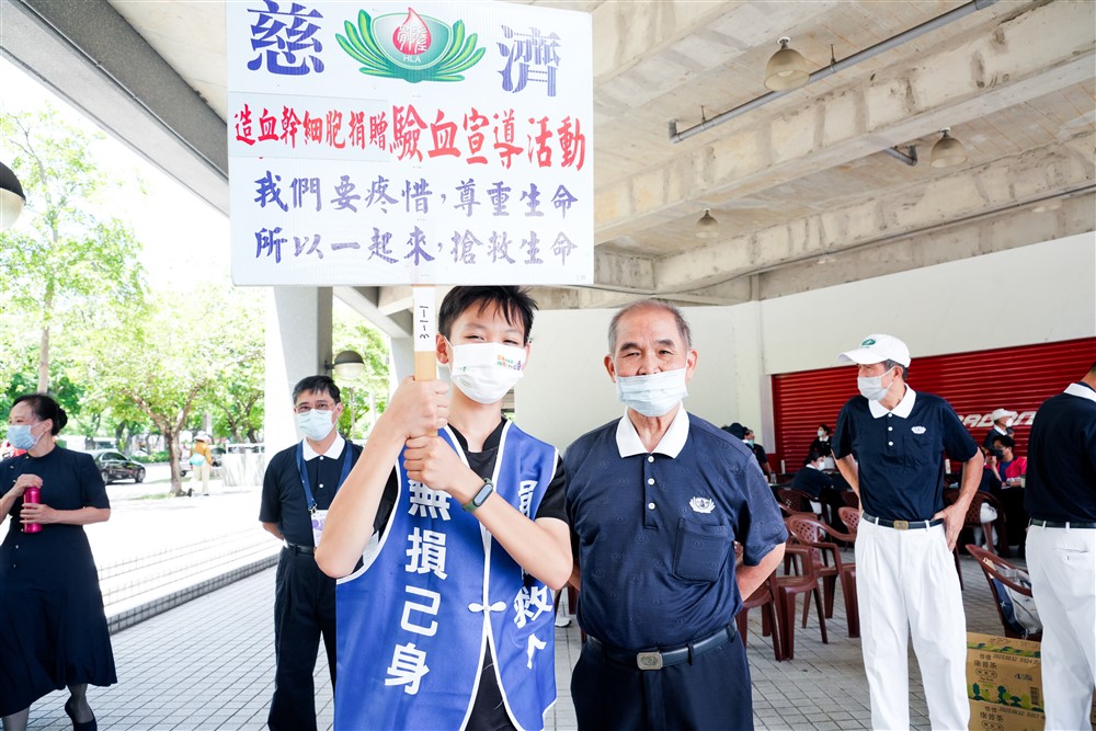 球賽活動前一晚,志工也把握時間再宣導。天母慈少班吳尚謙跟著阿公吳嘉博做好事,舉牌穿梭在棒球場中,爺少倆,一個舉牌、一個照相,只要再多一個人願意驗血登記,救人的感覺真好。