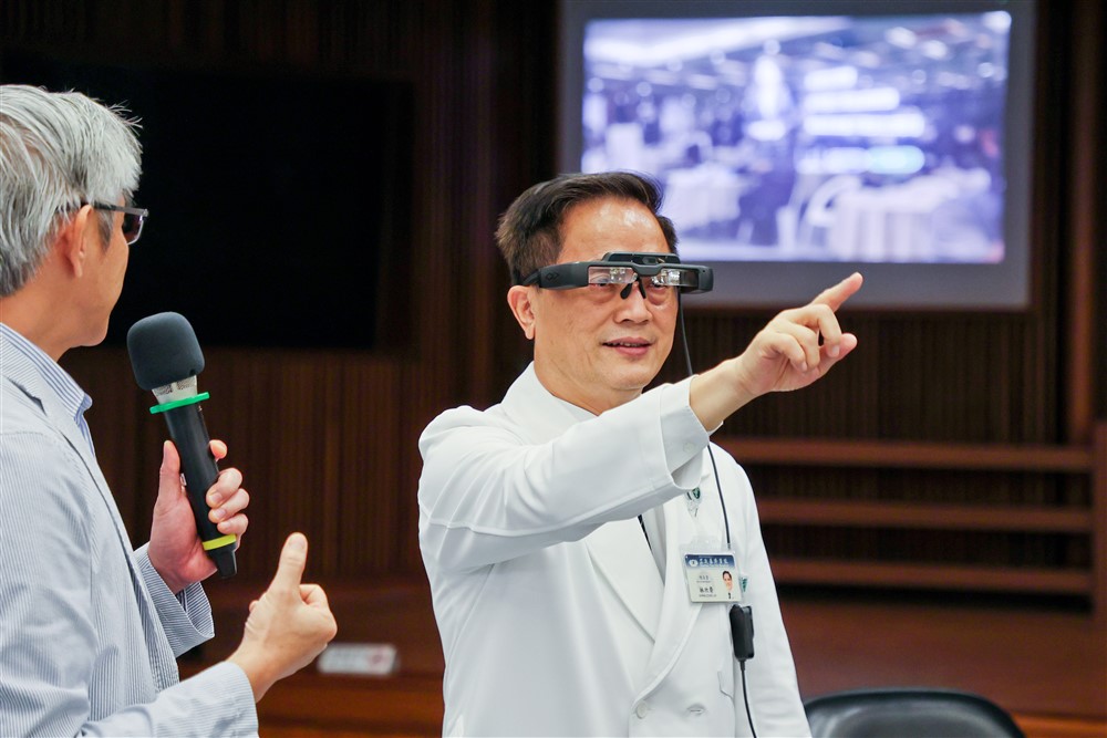 林欣榮院長戴上AR 眼鏡,體驗「AR 智能解說員」,不僅可以向民眾推廣捐贈造血幹細胞的善舉,並解答相關問題以及釐清可能的疑惑。