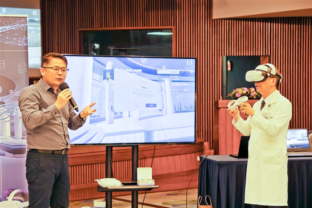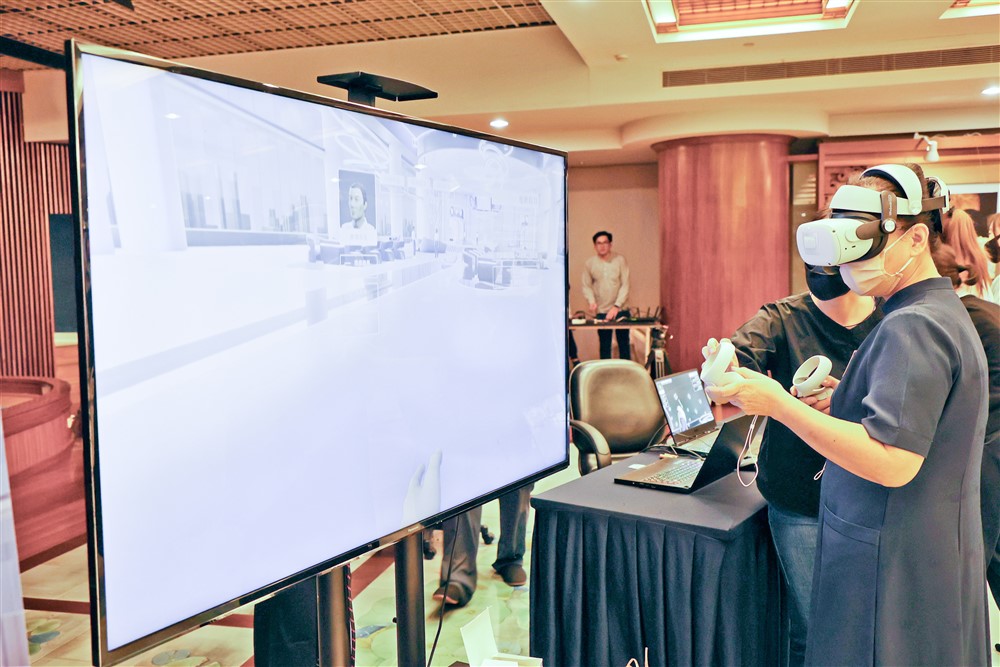 吳彬安副院長( 右) 體驗「造血幹細胞捐贈元宇宙」跨平臺系統。