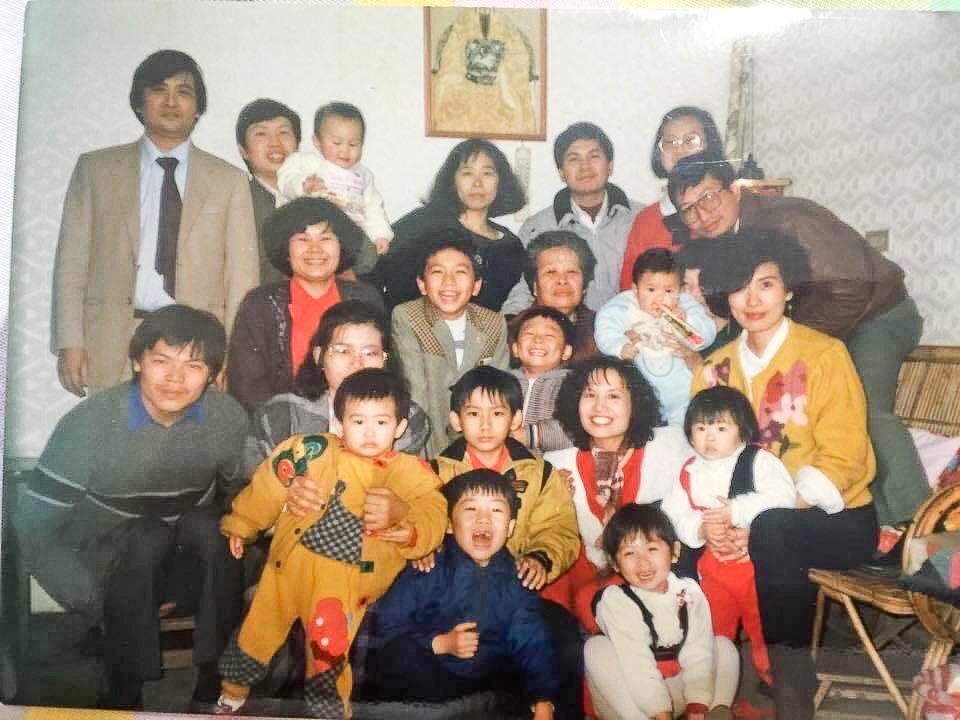 彭浚愷的叔叔彭偉民(後排右三) 是早期為慈濟興建護理宿合大樓、醫院二期工程與慈濟醫學院的工地主任。彭浚愷(前排中黃衣)、母親(左前二) 與弟弟(左二黃衣者) 合影。圖/彭浚愷提供