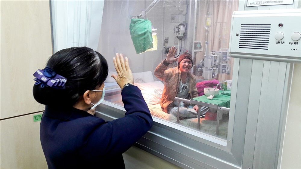 在移植病房隔離期間,臺南與高雄兩地志工接力照顧,為他加油打氣。