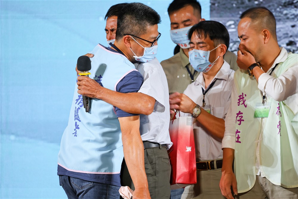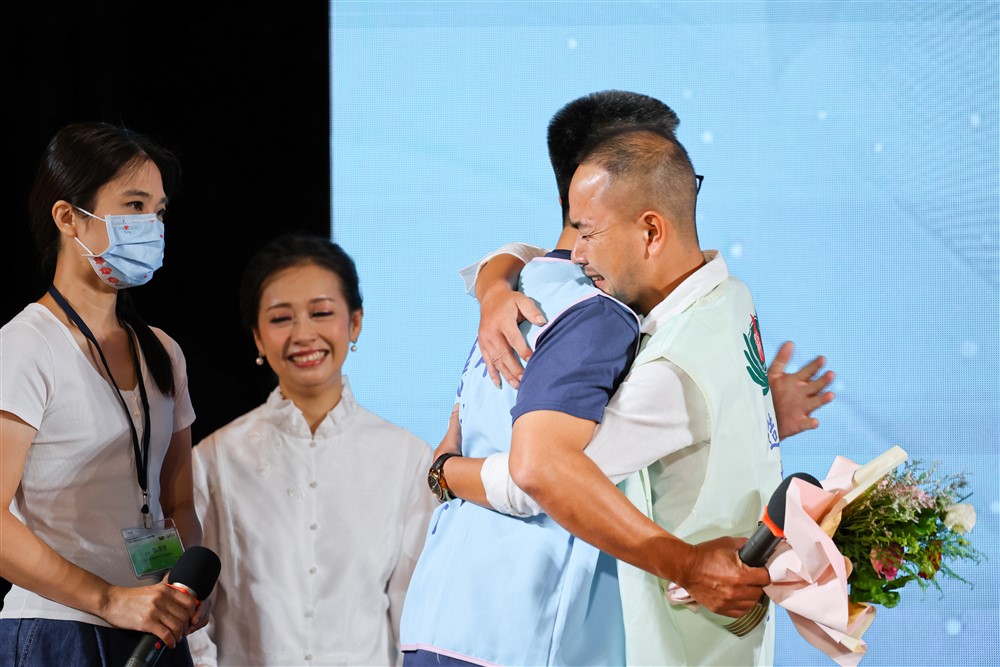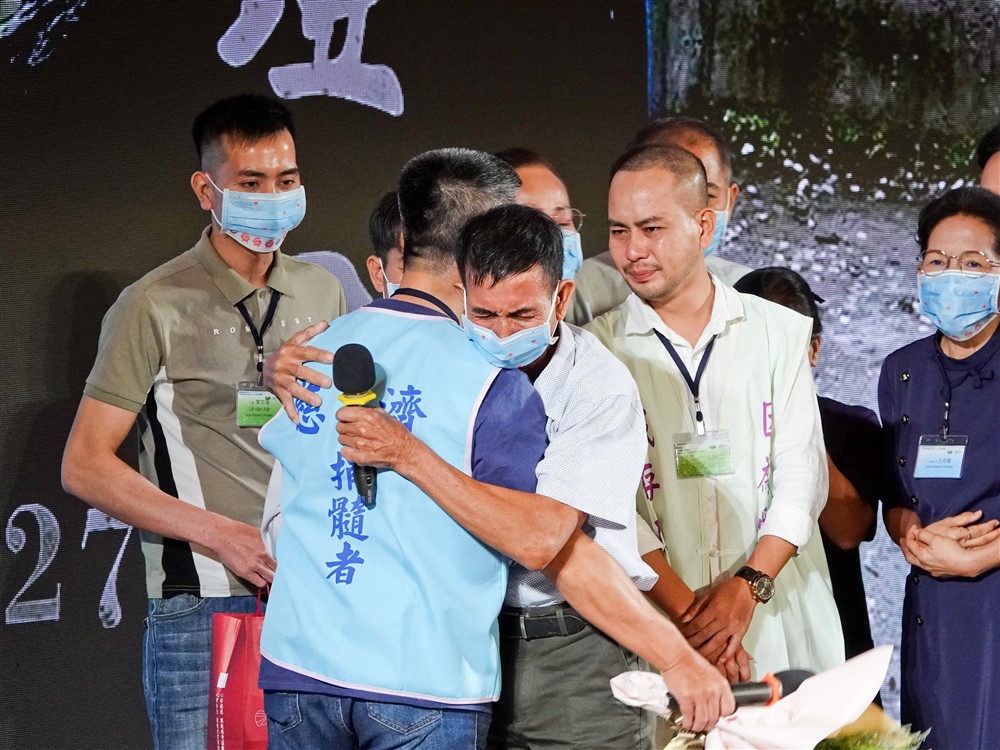 「沒想到,我還能活著見到救命恩人。」哽咽的黎文任面向施協局,接著說:「今天能夠站在這裡,都要感恩您的愛心。我身上流著您的血,您的年齡(比我大),就是我的兄長,不知道您是否願意,在我的心中已經認定您就是我的哥哥,我覺得自己已經跟您結拜為兄弟了。」