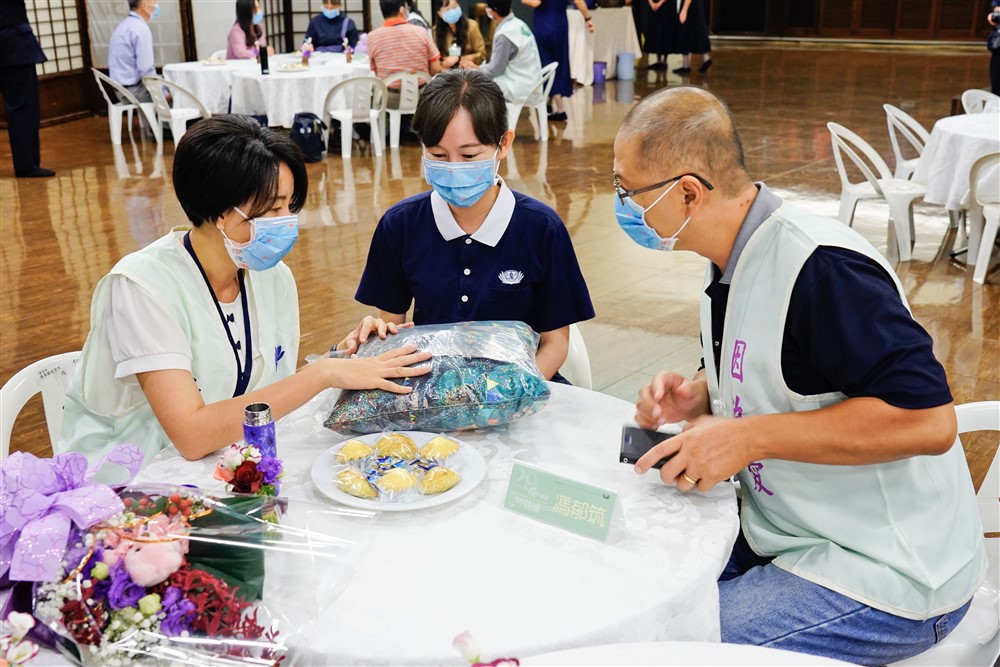 相見歡當天,捐者馮郁筑(左)帶來親手設計的貓頭鷹抱枕相贈,說明抱枕代表福報,祝福林良育(右)與家人幸福平安。攝影/蘇峻民