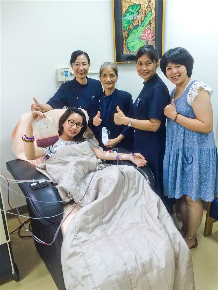 志工全程關懷陪伴,讓郁筑和姊姊少了擔心害怕。看到隨行的志工李素月空檔時間不斷在念《地藏經》,姊姊玉芳好奇問她為什麼要念經,原來素月師姊是向地藏菩薩祈禱,希望捐贈過程一切順利,別讓妹妹太辛苦。聽到這些話,玉芳好感動。