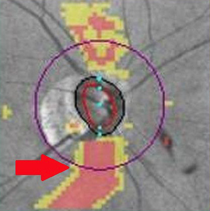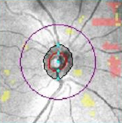眼科詹立瑋醫師發現周小姐的視力、眼壓雖在正常值範圍內,不過視神經盤有凹陷變大、部分視神經萎縮,進一步安排光學同調斷層掃描,發現視網膜神經纖維變薄;而視野檢查,也明顯看到周小姐雙眼的視野出現狀況,上半部已經有一大塊的視野缺損,確診為青光眼,再不治療恐有失明之虞。詹立瑋醫師開立眼藥水,請周小姐按時點藥,經過三個月之後,她的兩眼眼壓降低,後續複診追蹤視神經纖維的厚度沒有再惡化變薄的情形,顯示青光眼趨於穩定。