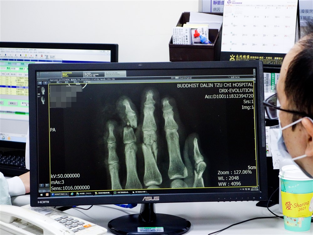 X光檢查顯示左手第四指斷掉。