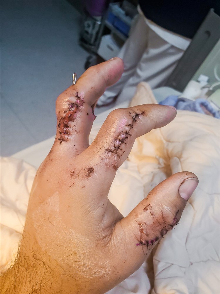 一位三十九歲的麵包師傅開車送貨,開車門正準備離開時,不慎慘遭後方行經車輛的後照鏡碰到,當場造成左手指被夾斷四根,血流如注,緊急趕往大林慈濟醫院治療,經整形外科許宏達醫師進行顯微重建手術,將粉碎性骨折的手指一一拼湊接回,順利讓他三個月後恢復功能,開心回歸職場工作。