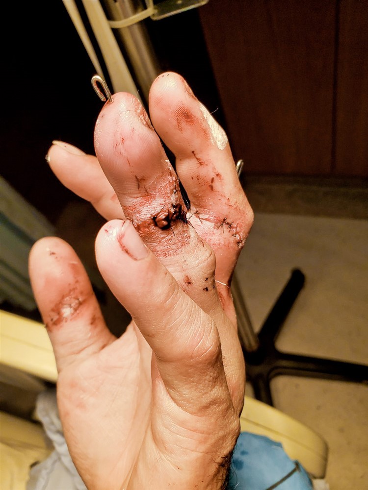 蔡先生說,那天早上因為公司要載蛋糕,車子暫停在路邊,沒想到才剛上車不久,即將關上車門,結果一台車子突然從後方行駛過來,剛剛好對方車子的後照鏡就夾到他還在車門上的手掌。當時還沒有感覺到痛,隨後立即報警、叫救護車,直到醫院的急診部,才發現自己左手的第四指已斷掉,僅剩下皮膚掛著,醫護人員在初步處理傷口時,蔡先生這時才痛到失去知覺。