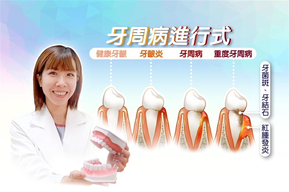 何曉涵醫師表示,牙周病成因是牙菌斑,不良的清潔使得牙菌斑長期堆積,起初出現牙齦炎症狀,牙齦發炎紅腫,刷牙時流血;持續惡化則進展為牙周病,齒槽骨受到破壞,更嚴重則會出現牙齒鬆動、牙齒位移,甚至牙齒脫落等症狀。