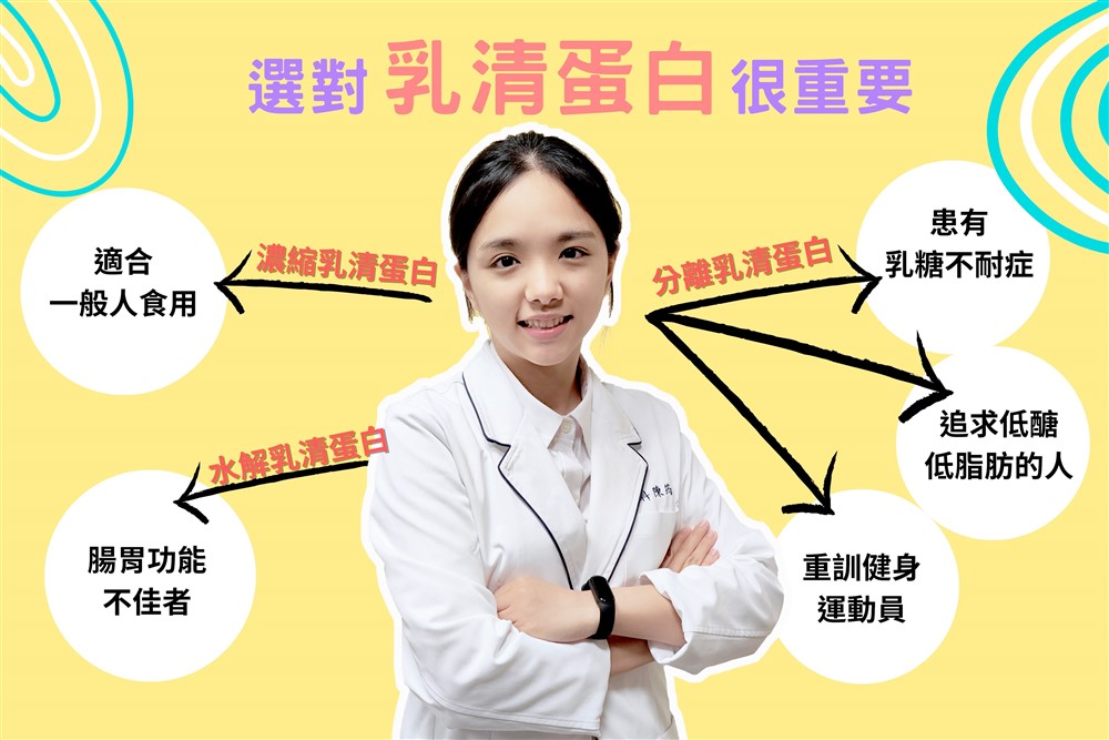 台中慈濟醫院陳筠涵營養師建議選擇乳清蛋白,要考量自己的身體狀況和運動量。