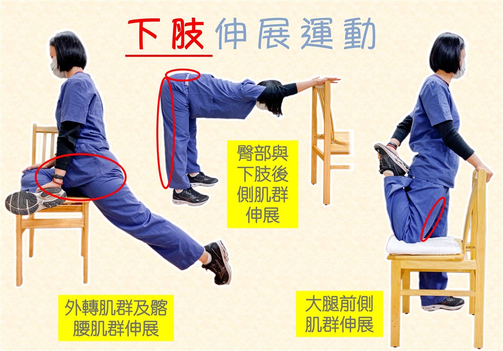 「每個人身體靈活度皆不同,做伸展時也要小心。」林秀玲提醒,伸展運動的上身及骨盆要維持直線朝前,下肢做到肌肉輕微痠痛即可,勿超過容忍範圍以免受傷。