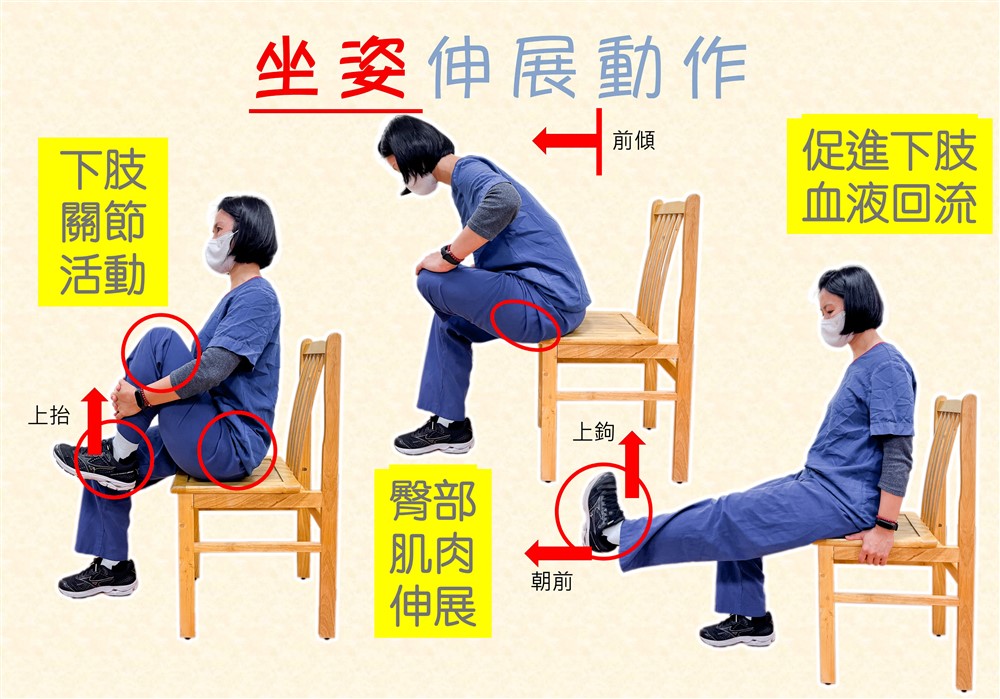 林秀玲物理治療師也示範,當活動空間有限,只能坐在椅子上時,可以進行的三種坐姿伸展。