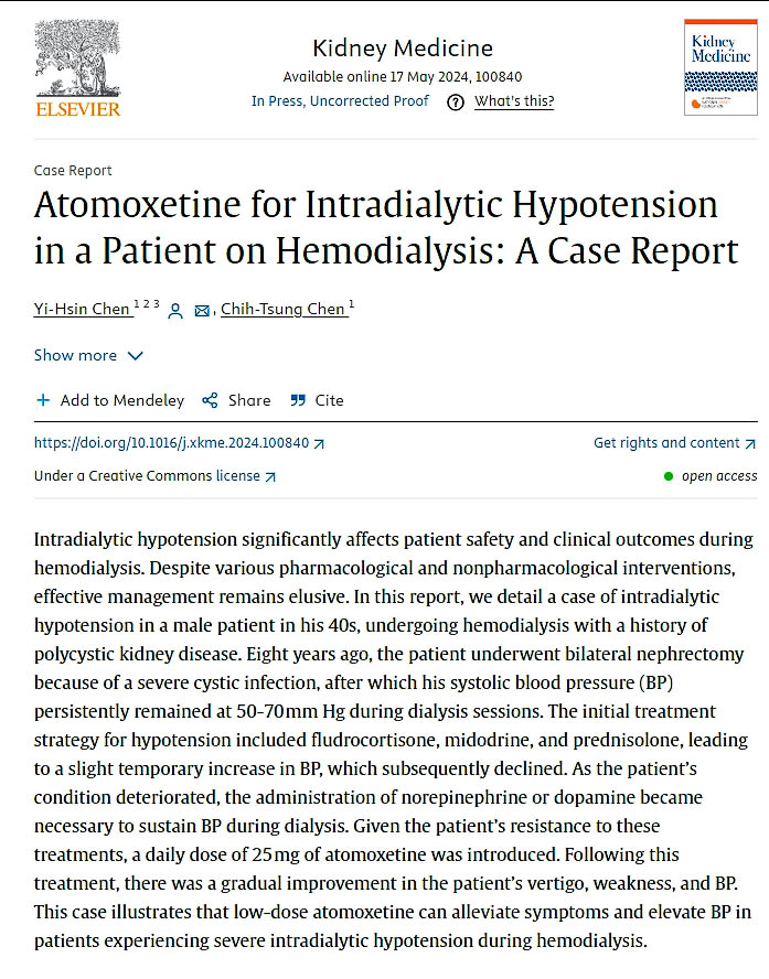 「陳醫師,拜託救救我兒子!」病人母親的悲切呼喚,牽動台中慈濟醫院腎臟內科主任陳一心十年不懈的努力,尋找解決雙腎切除病人長期低血壓的解決方法,發現治療過動症的藥物「阿托莫西汀(Atomoxetine)」,能成功改善病人透析低血壓的問題。研究成果經SCI 國際專業期刊之一的美國國家腎臟基金會期刊《腎臟醫學》(Kidney Medicine) 審核發表,有助於改善全臺灣九萬名及全球約三百萬名透析病人的低血壓情形。