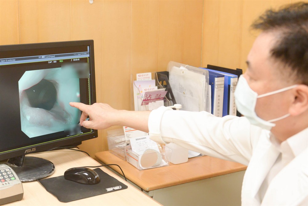 台北慈濟醫院消化外科伍超群主任透過電腦螢幕說明病人胃鏡檢查的結果,也說明為嚴重胃食道逆流病人治療的術式及考量。