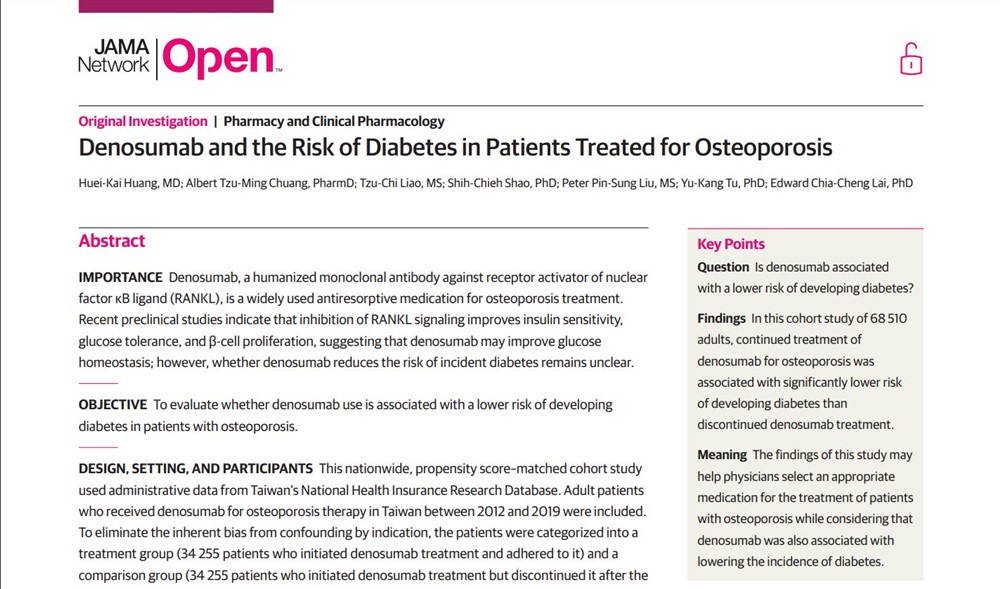 花蓮慈濟醫院與成功大學、臺灣大學跨院校合作最新研究發現,治療骨質疏鬆症的常用抗骨吸收藥物denosumab 也可能同時降低糖尿病風險,此發現幫助醫師為骨質疏鬆症病人選擇抗骨質疏鬆症藥物時,考慮到對糖尿病風險控制的益處。這項研究獲美國醫學會官方期刊系列JAMA Network Open 刊登(https://reurl.cc/pvnWEl),而刊登後隨即受到許多國際媒體報導。