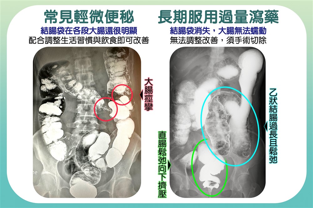 左圖顯示輕微便祕的腸道狀況,大腸蠕動正常,調整生活習慣及飲食即可改善;右圖為長期過量服用瀉藥的腸道變化,結腸袋消失,無法蠕動,須靠手術解決。圖/陳彥儒製圖