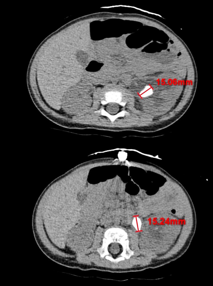 出生僅十一個月的寶寶因發燒就醫,原先以為是泌尿道感染,沒想到照了腎臟超音波,發現腎臟有兩顆超過一公分的結石,其中一顆堵在輸尿管與腎臟的銜接處,造成堵塞與腎水腫。媽媽表示,三個月前孩子就曾因泌尿道感染而發燒,到其他醫院治療,當時透過藥物控制下來,燒退後就回家了,所以這次發燒,就以為又是泌尿道感染,想不到是腎結石。
